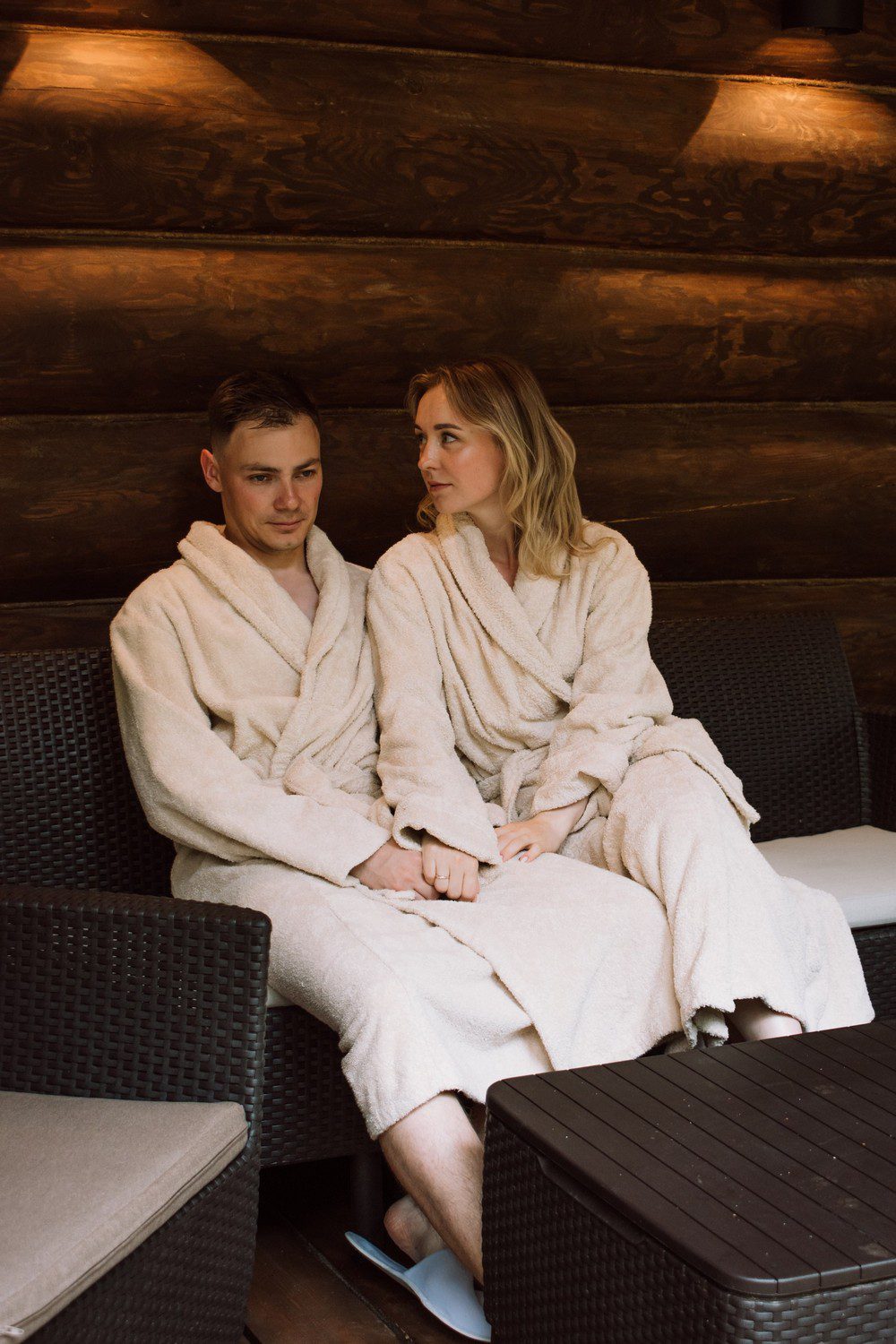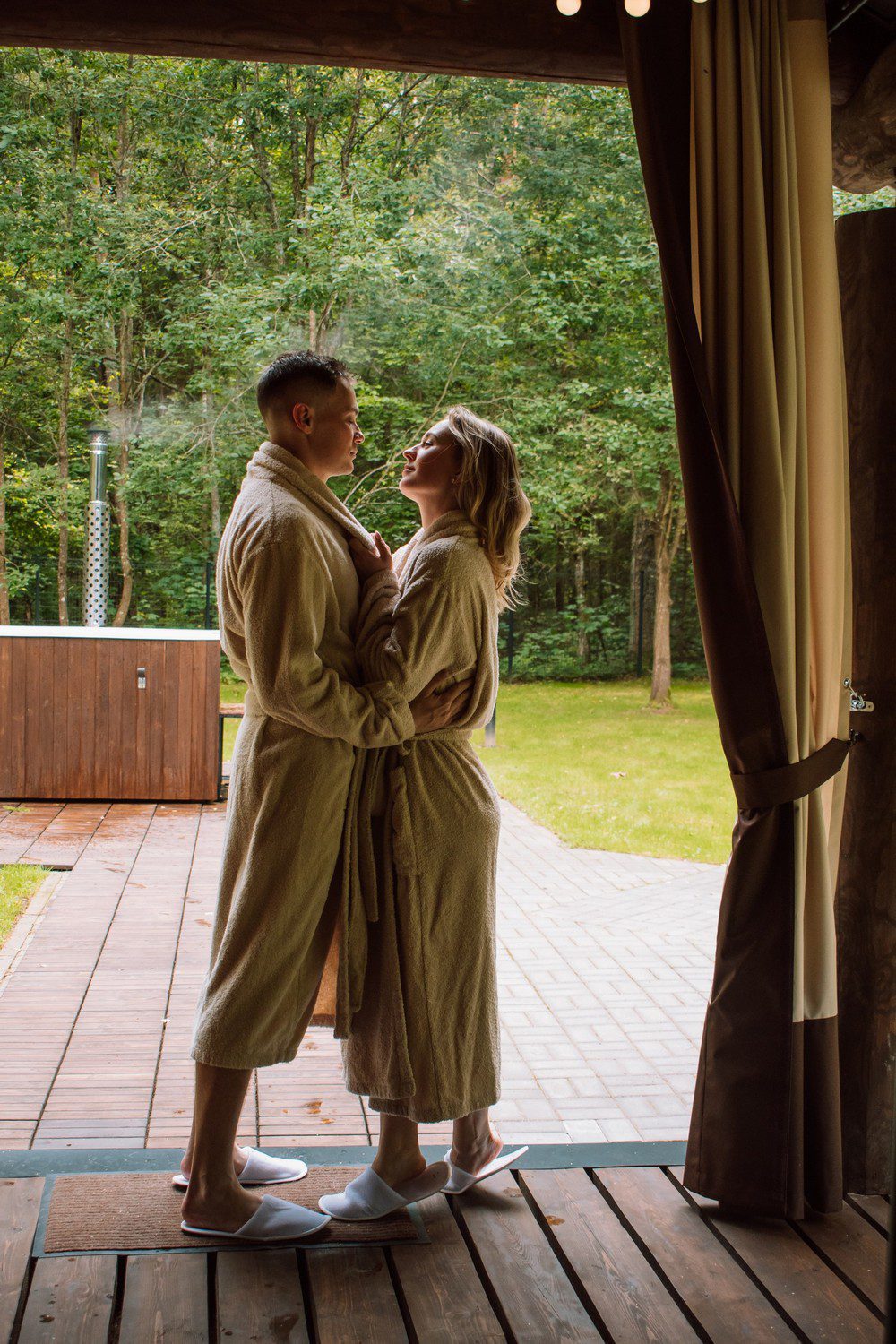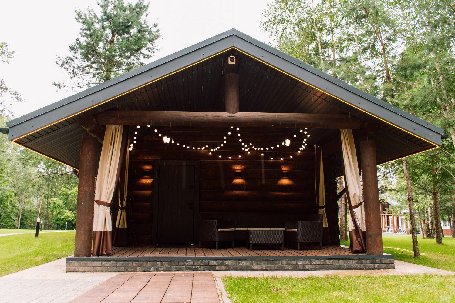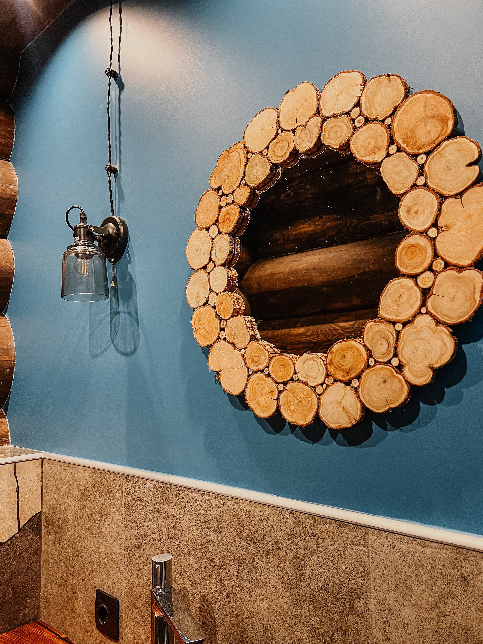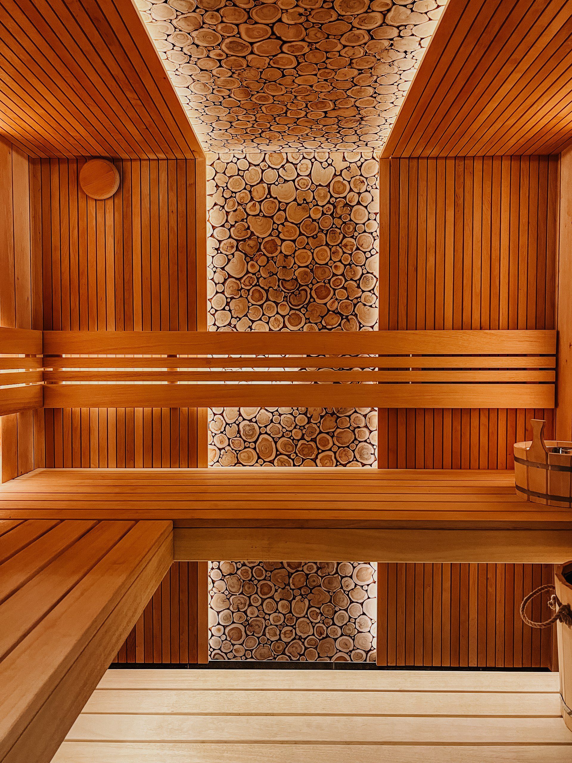 Интерьеры бани оформлены с использованием натуральных материалов, таких как дерево и камень, создавая уютную и расслабляющую атмосферу. Этот подход подчеркивает премиальный статус места и его уникальность.