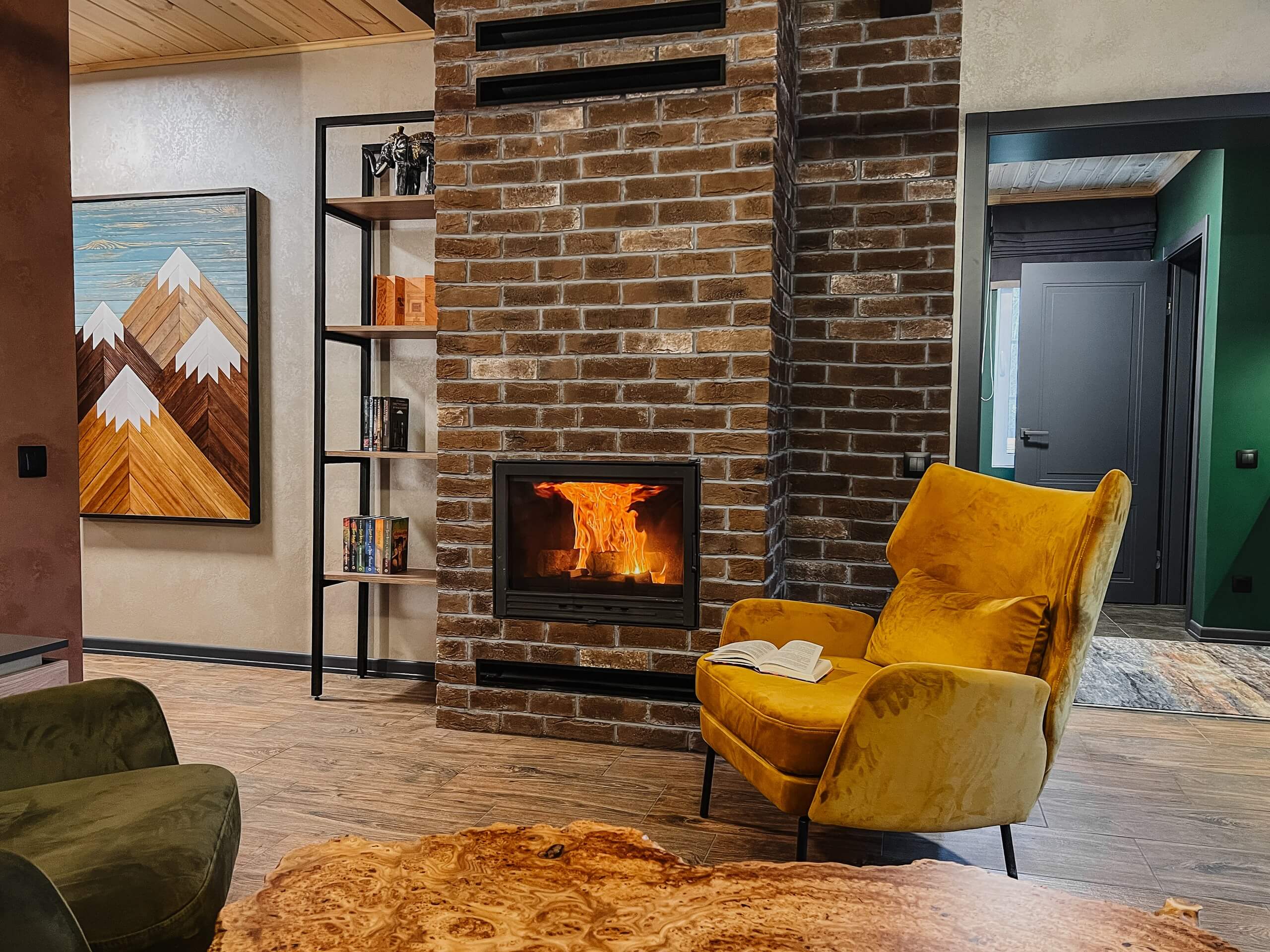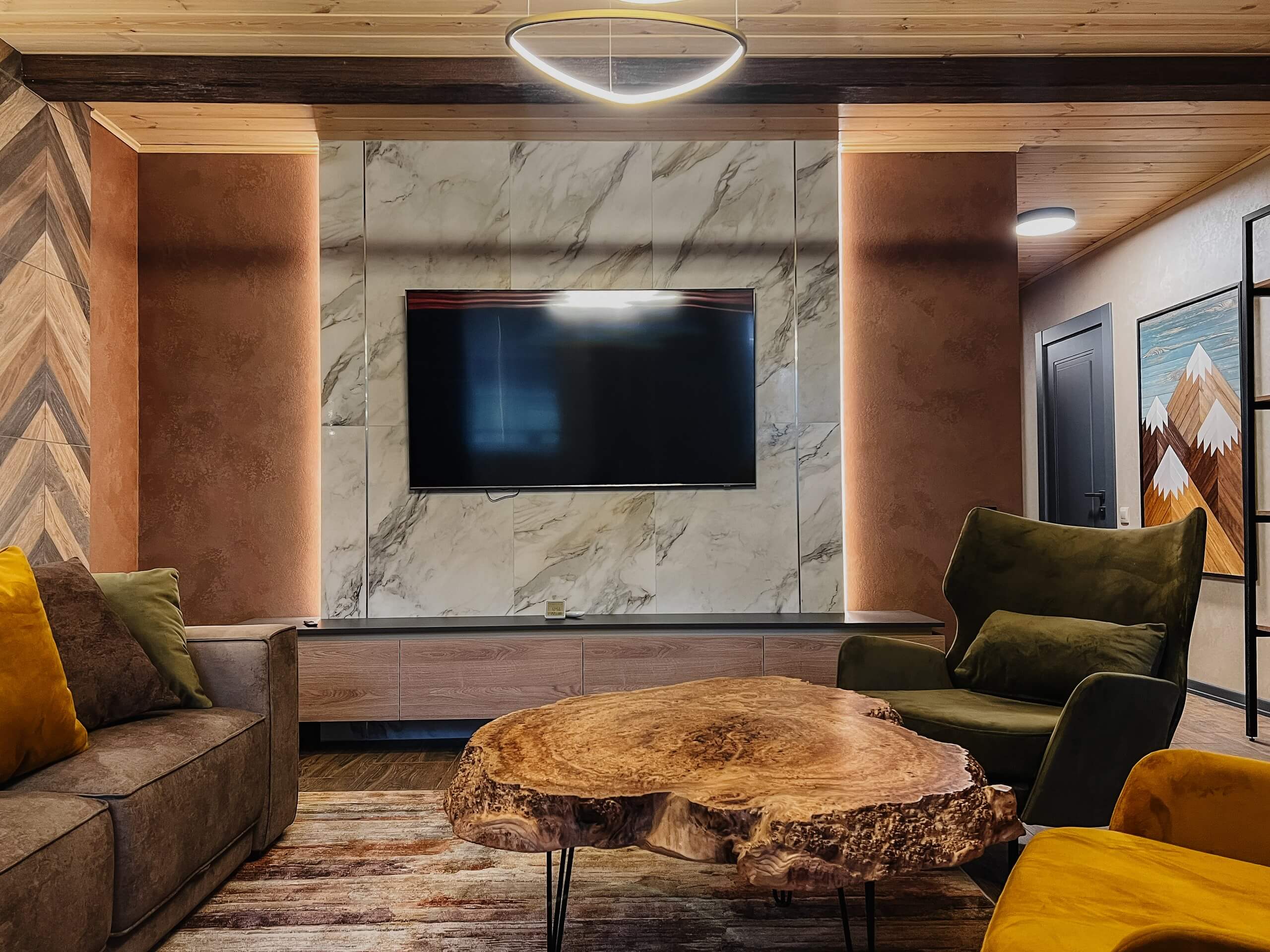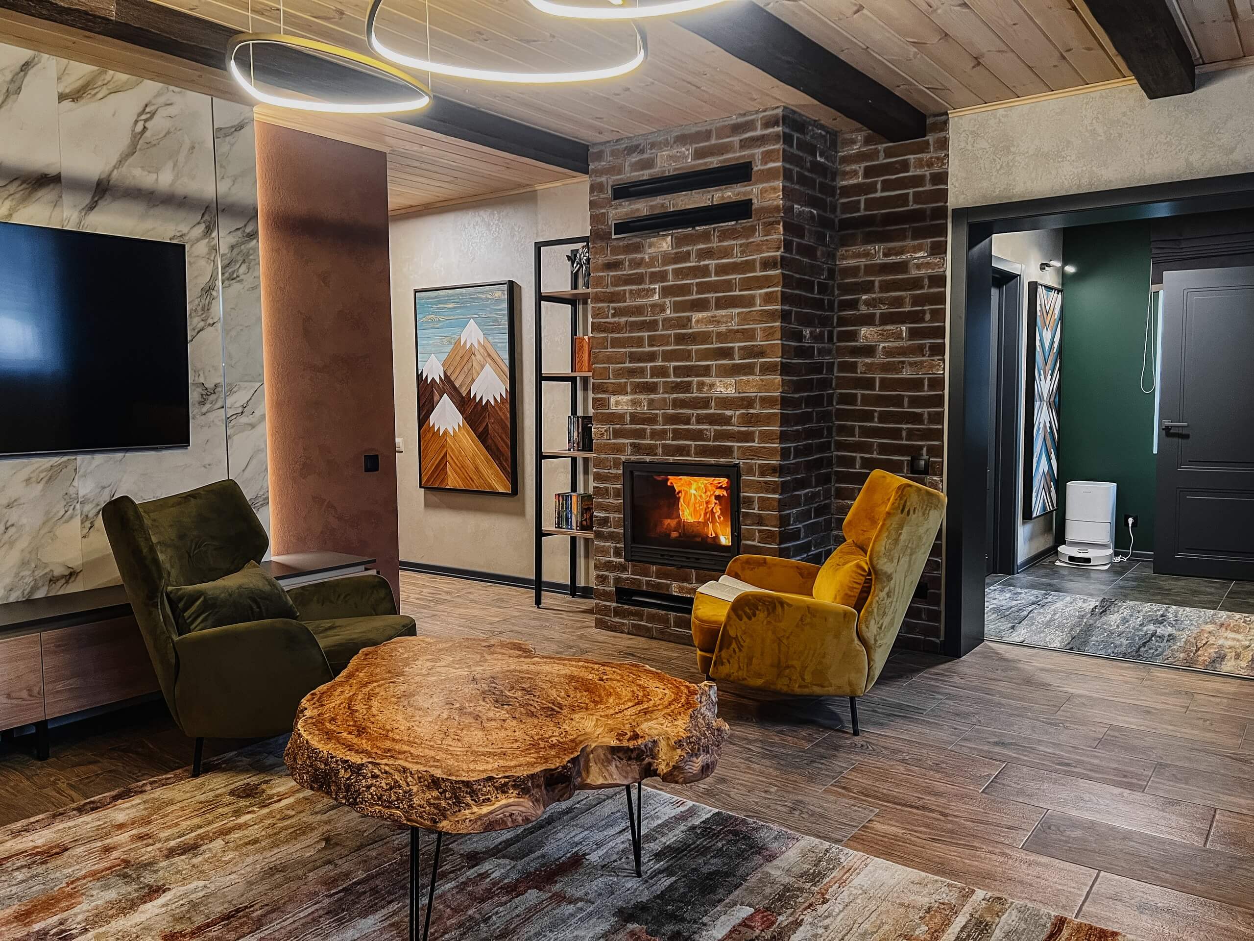 - Уютная гостиная с камином для теплых вечеров и с телевизором с функцией Smart-TV.
