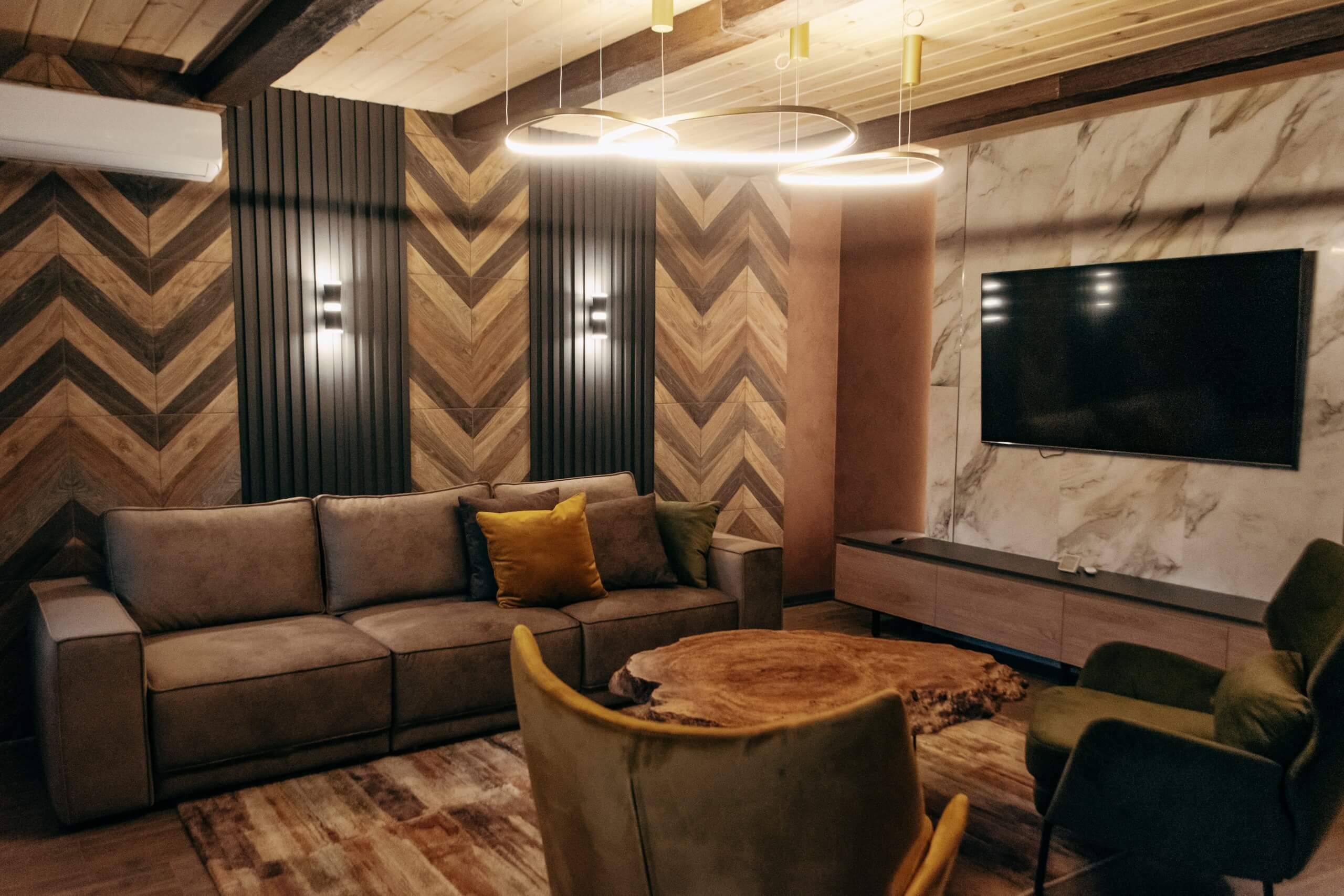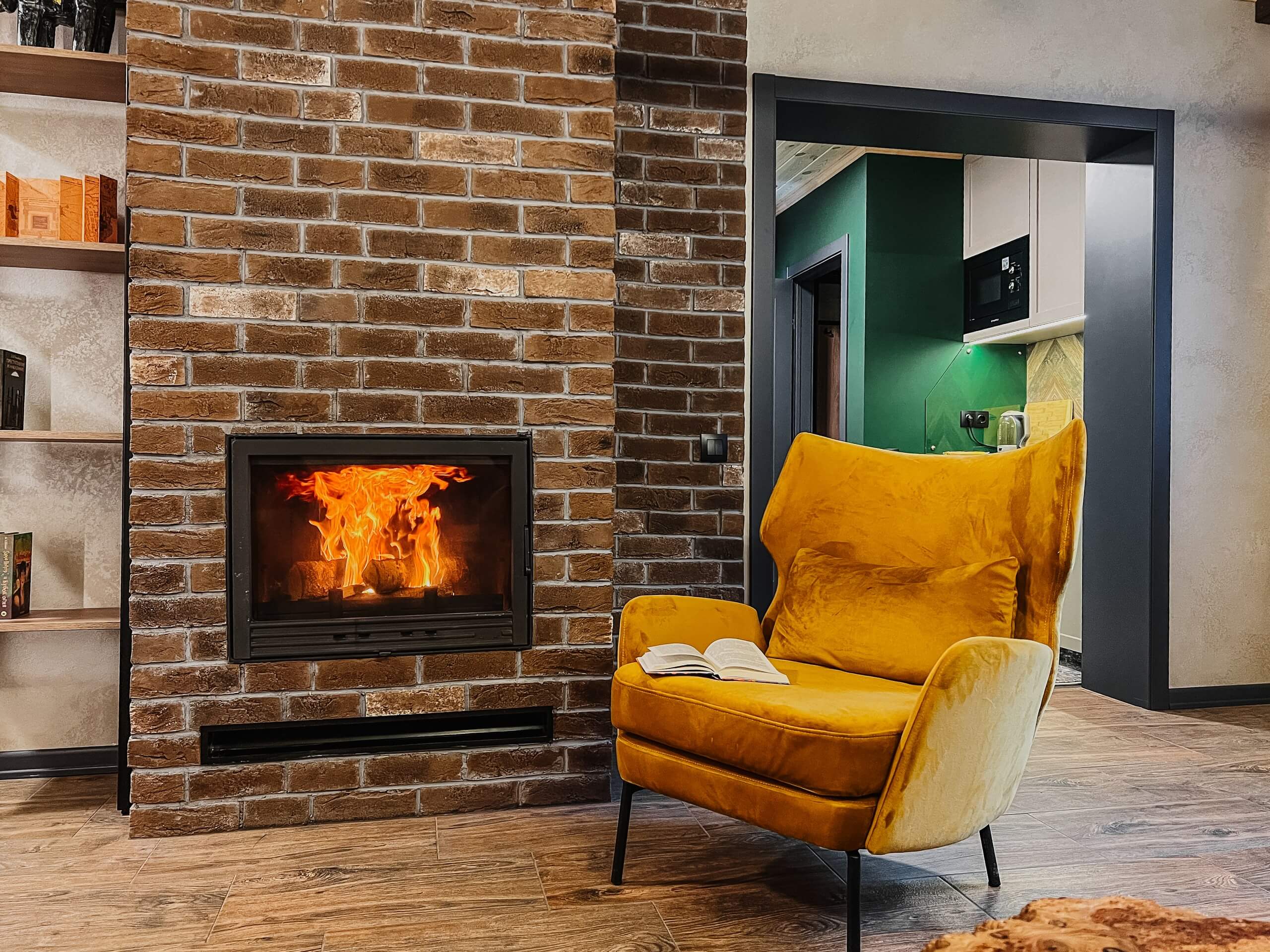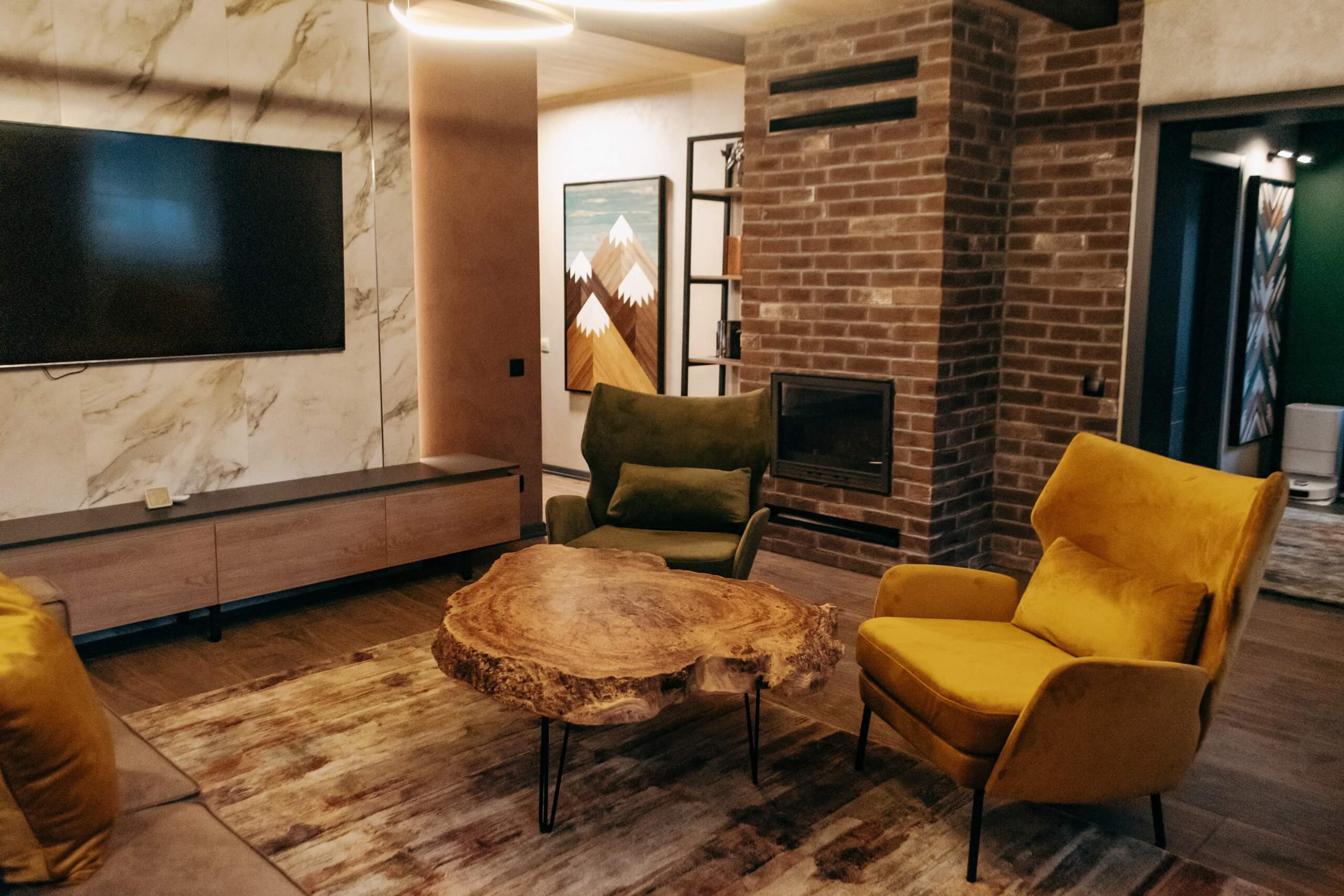 - Уютная гостиная с камином для теплых вечеров и с телевизором с функцией Smart-TV.