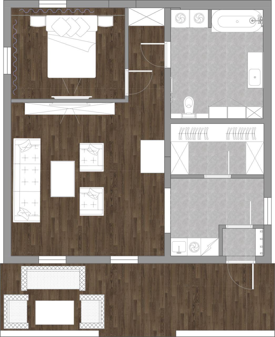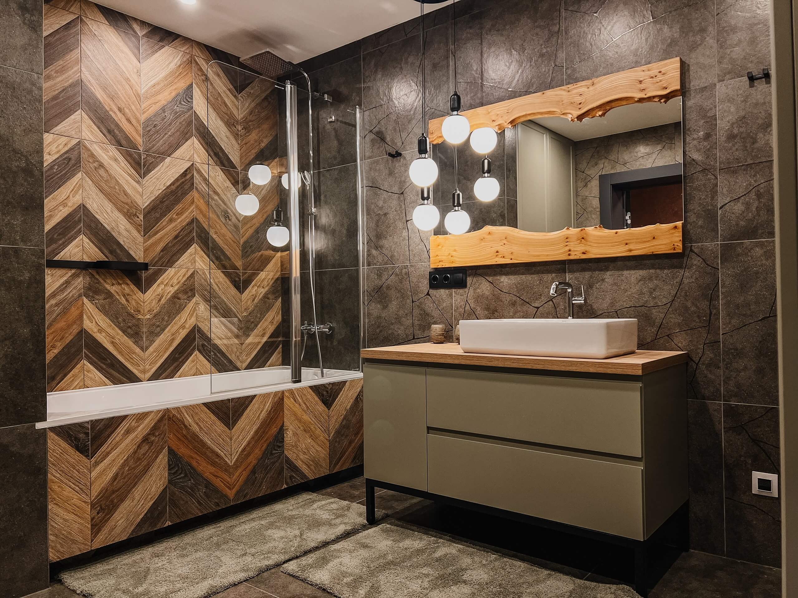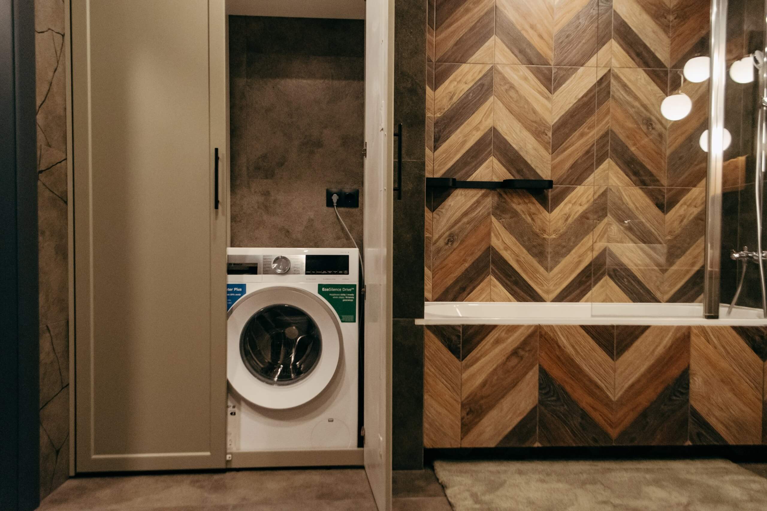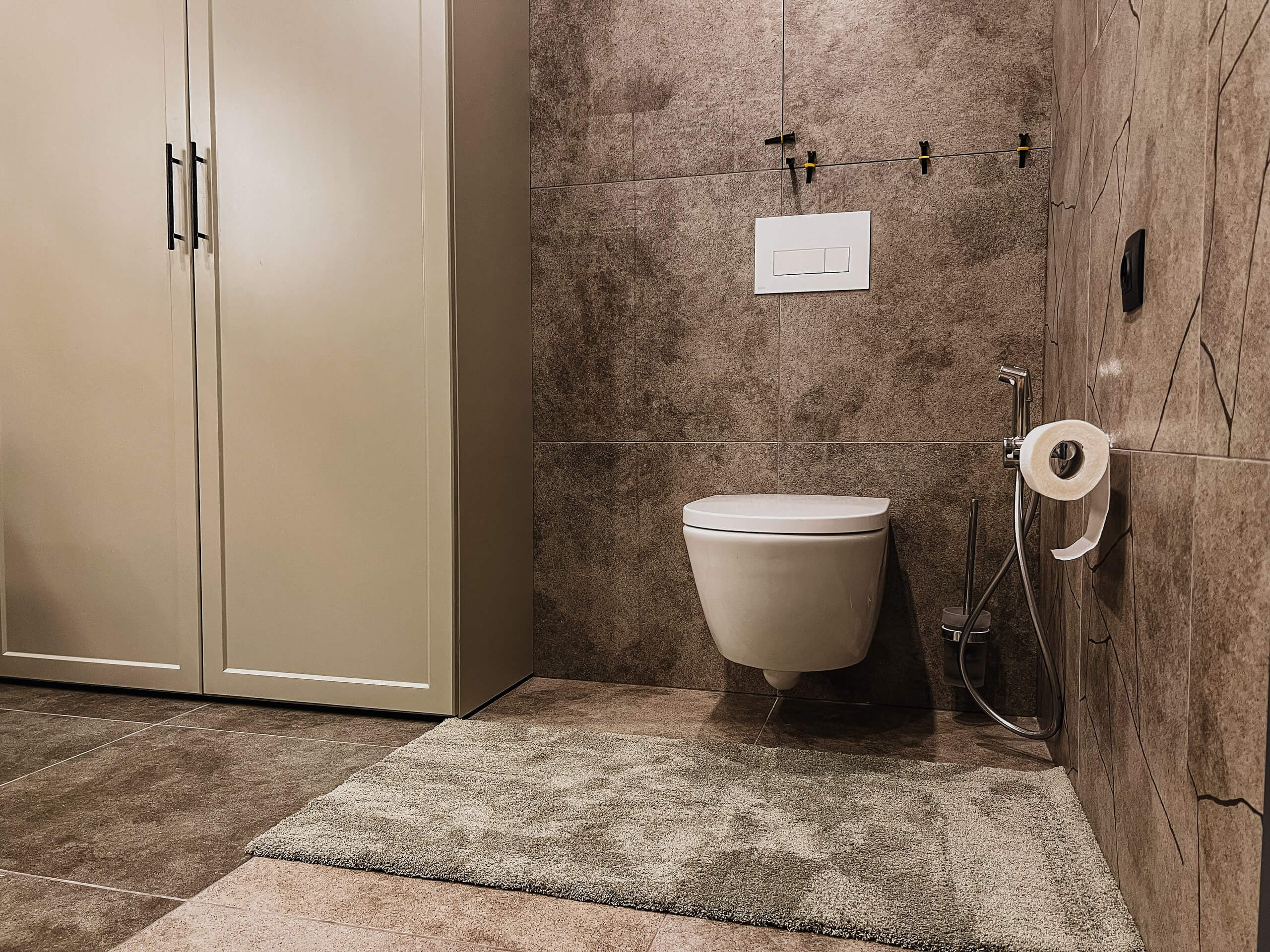 Большая ванна и душ, туалет, стиральная машина с сушилкой, фен, гигиенические принадлежности.