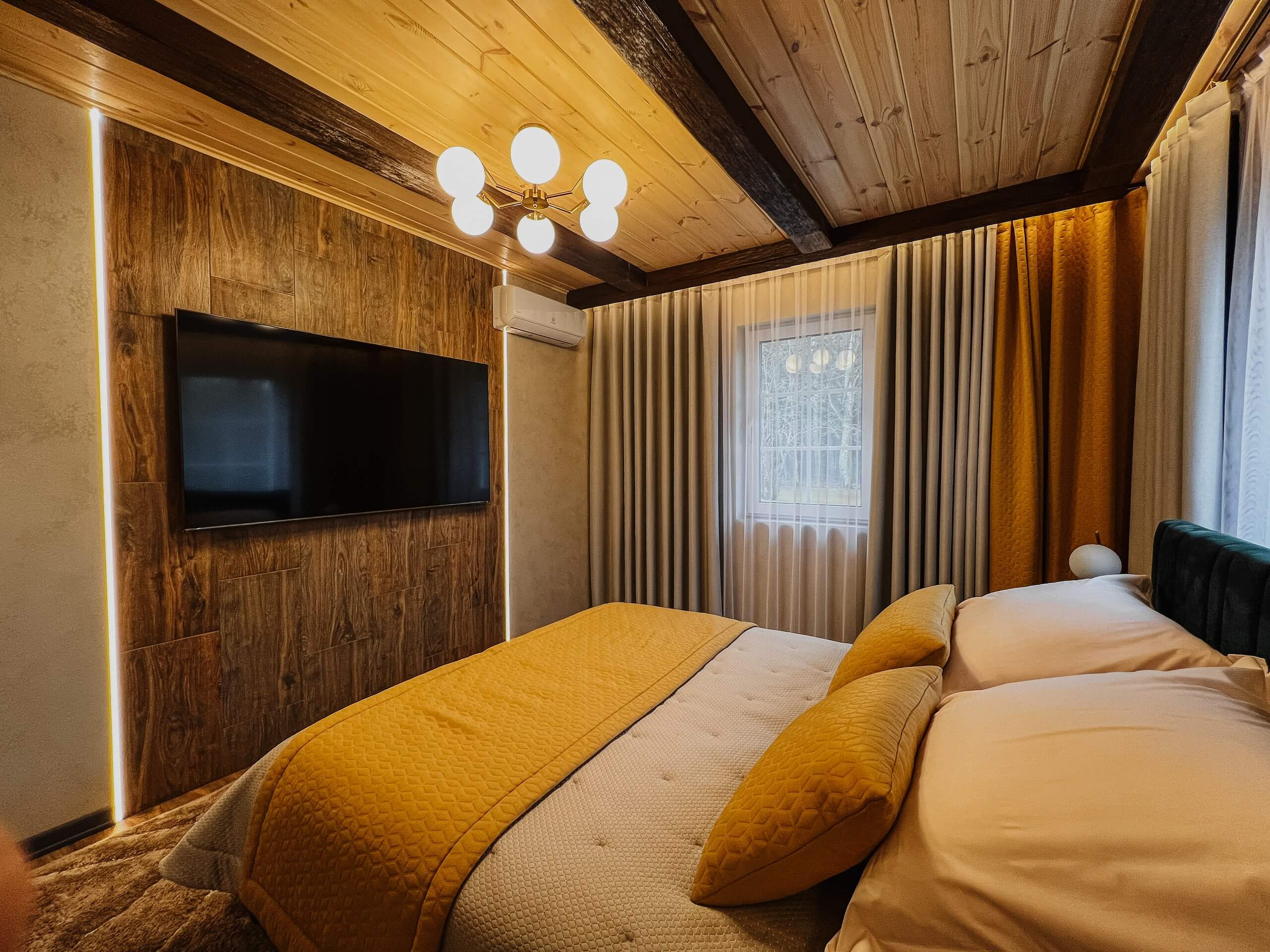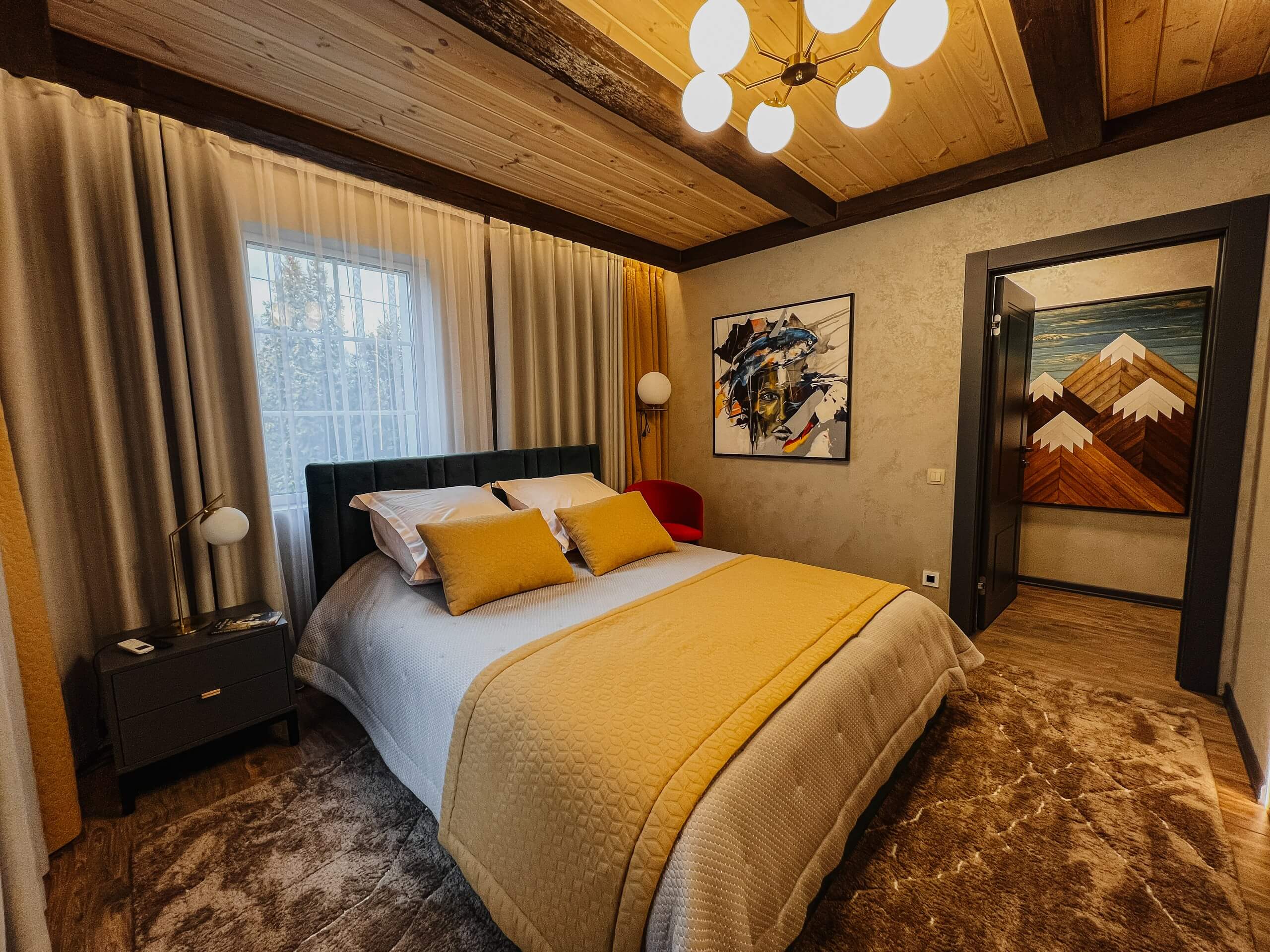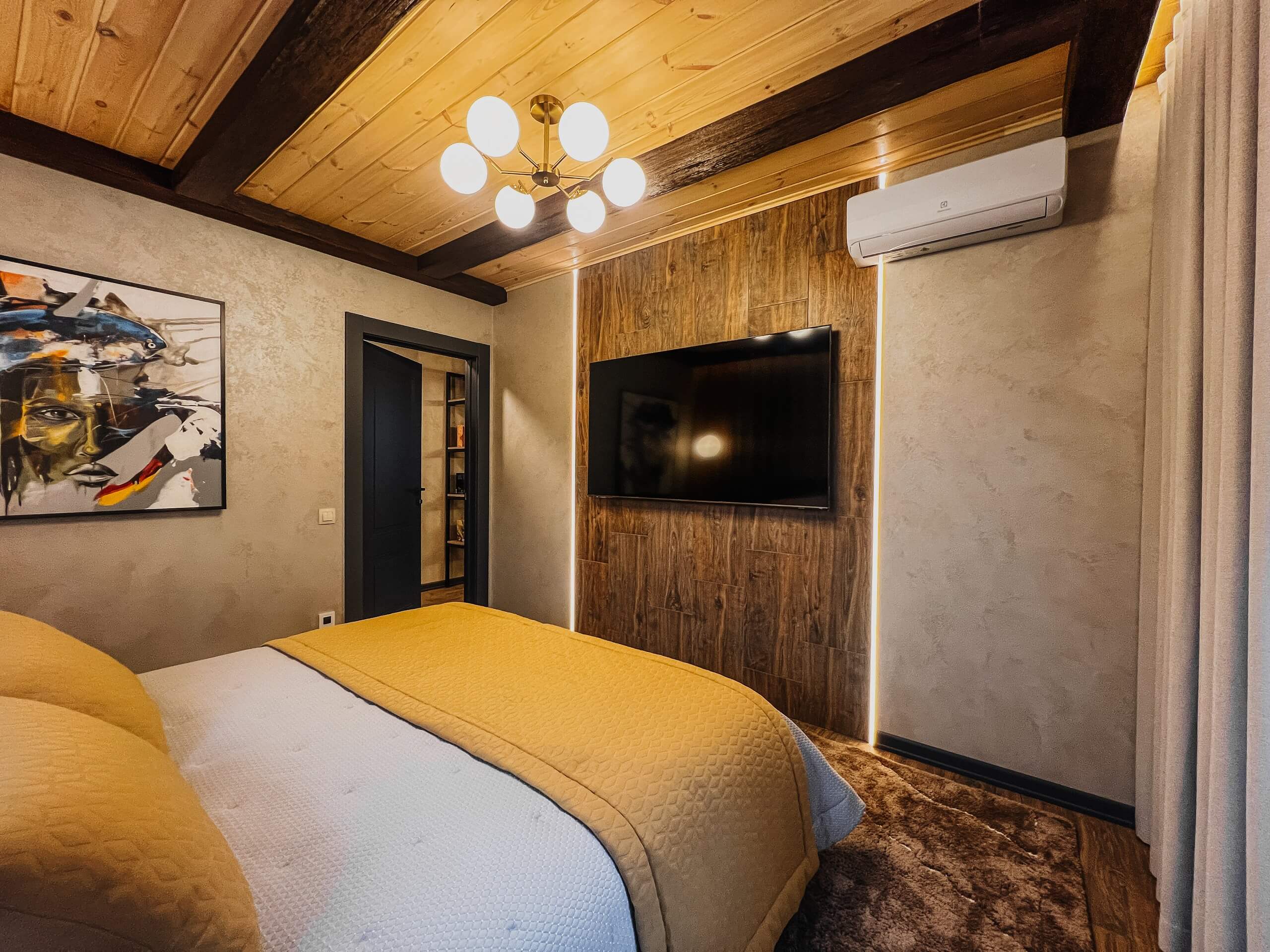 - В спальне имеется двуспальная кровать с ортопедическими матрасами, телевизор OLED 75-дюймов с функцией Smart-TV